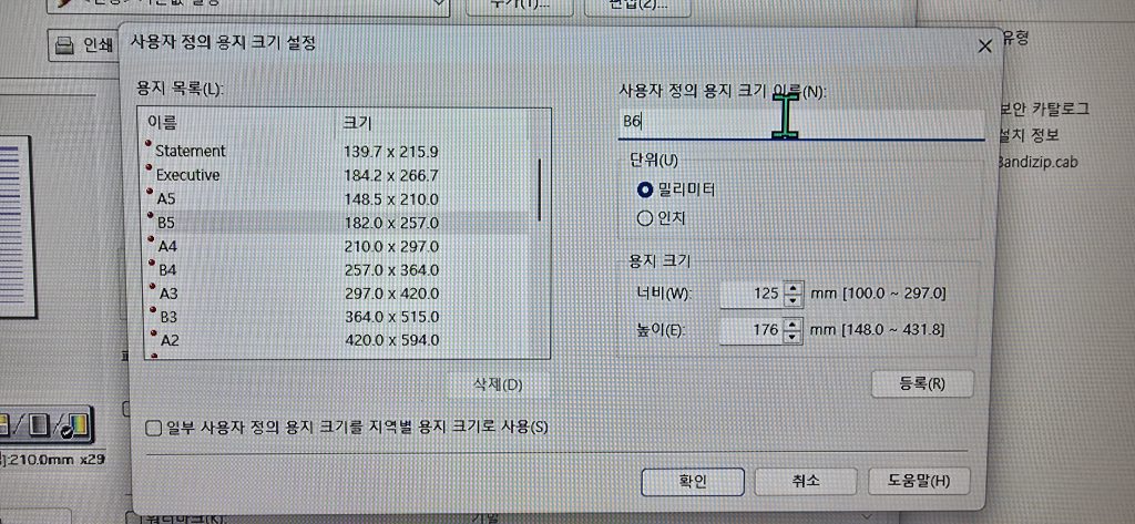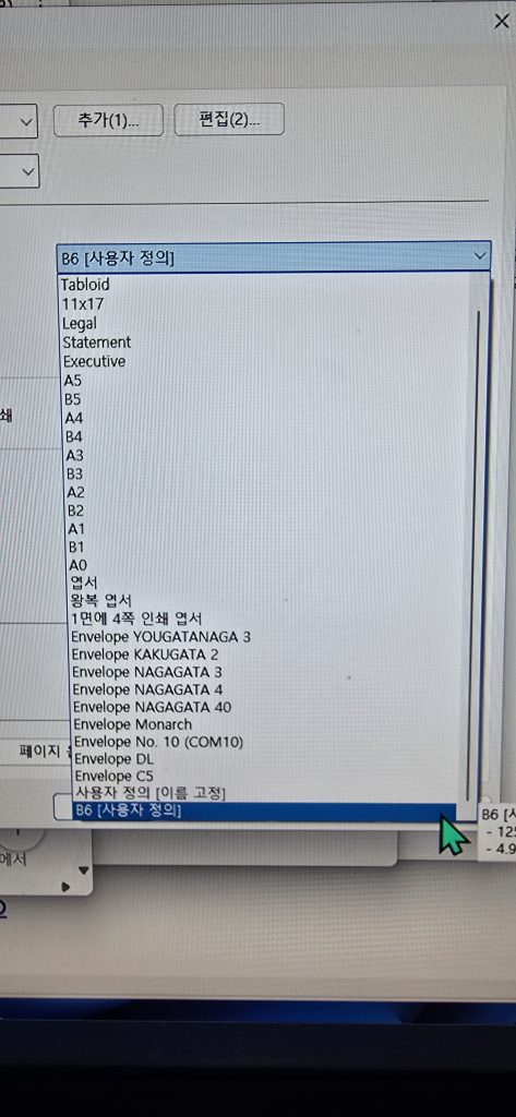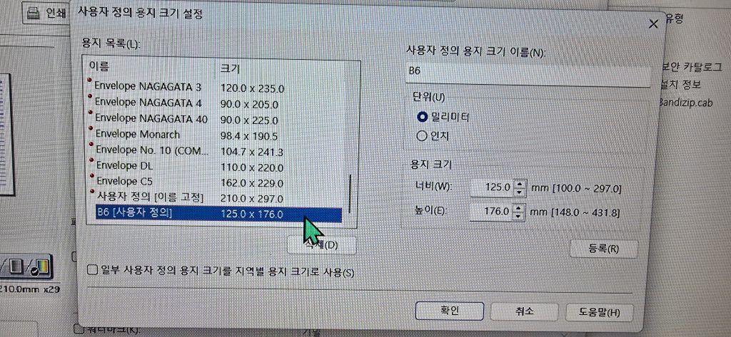 [캐논] 인쇄기본설정 – 사용자 정의 용지 크기 추가방법 안내 게시일: 2026년 03월 26일업데이트 날짜: 2026년 03월 26일게시자: admin카테고리:프린터 프로그램 사용자 정의 용지 크기 설정 – 빨간 점 ● 으로 표시된 용지 목록 아무거나 누른 후 우측에서 용지 크기 이름 변경 – 용지 크기 변경 후 [등록] 용지 목록에 추가된 B6[사용자 정의] 확인 선택 항목에 추가된 B6 [사용자 정의] 선택 Post Views: 14 admin 2870.kr